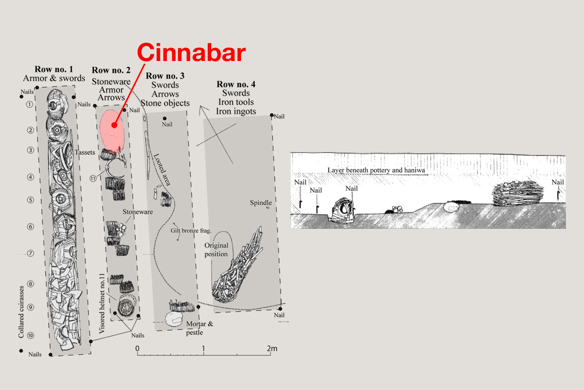 The major focus is the space at the north end of the second row. Red pigment was found here. Regarding the Nishi-Hakayama Kofun, referred to above as not designed for human burial, no dispersion of red pigment has been found; in general, red pigment was frequently sprayed on wooden coffins in tombs. Therefore, human burial is a likely possibility. However, the problem is that the range of the red pigment is only about 70 centimeters long. An adult male would not fit.