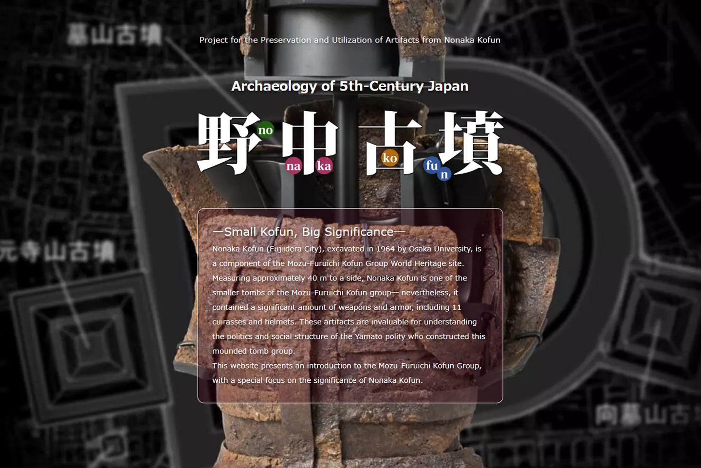 The Nonaka Kofun (Fujiidera City), excavated in 1964 by Osaka University, is likewise a component of the World Heritage group. At about 40 m on a side, the Nonaka kofun is one of the smaller ones in the Mozu-Furuichi group; however, it contains many weapons and arms, including 11 suits of armor (armor and helmets), sufficient to suggest the force and political strategy of the Yamato government of the time, which built the kofun group.