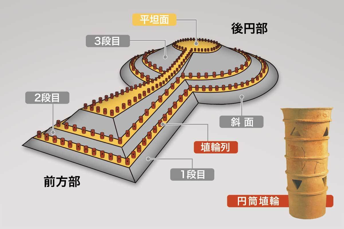 まず、墳丘は、土を盛り上げたり、元々あった自然の山を削ったりして形作られます。特に大きな古墳は、下から上までずっと斜面であるということよりも、途中に平坦な面(テラス)を挟むことが一般的です。この平坦面や、頂上の広くなっているところには、「埴輪」(はにわ)が並べられていました。
