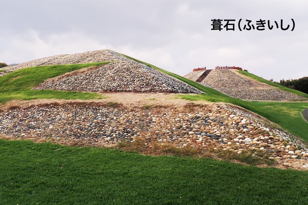 墳丘の平坦面には、いま述べたように埴輪が据えられましたが、傾斜面には、人頭大の石が積み上げられました。これらを「葺石」(ふきいし)と呼びます。この葺石が施されることによって、墳丘全体がまるで石の山のように見えたのです。